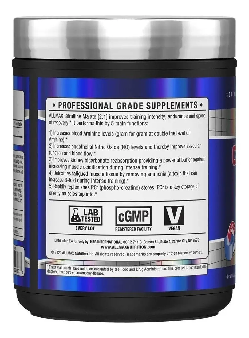 Uso Sugerido Tome 1 cucharada medidora (2 g) de Malato de citrulina [2:1] de ALLMAX hasta 3 veces al día, al despertar y aproximadamente 45 minutos antes de entrenar o realizar cualquier actividad física intensa. En días sin entrenamiento, consuma antes de las comidas con el estómago vacío. Puede ser agregado a fórmulas de preentrenamiento.