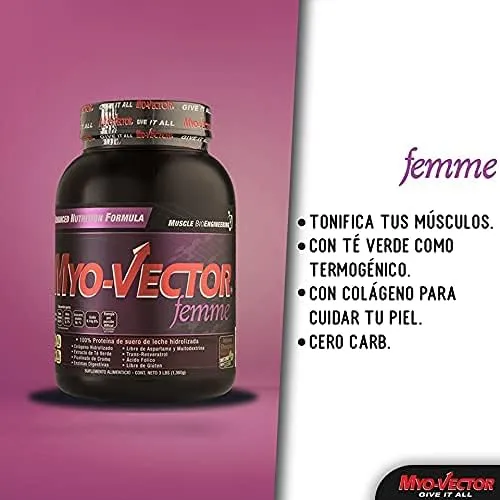 Proteina Myovector Femme 3 Lb Zero Carbs 44 Servicios es una fórmula diseñada para el cuerpo femenino, enfocada en promover un físico esbelto y tonificado. Myo-Vector Femme destaca por su excelente sabor, derivado de ingredientes naturales y extractos de fruta. Este producto contribuye a la firmeza de la piel, ligamentos y tendones, además de tonificar los músculos para un aspecto atlético. Incluye Té Verde, que asiste en la reducción de grasa corporal. Especialmente creada para satisfacer las necesidades nutricionales de la mujer y apoyar en la consecución de sus metas físicas.